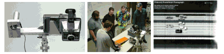 Fig. 7. The linear CCD array camera improvised from a hand-scanner introduces students to capturing and measuring the (above top) oscillatory motion of springs, (above left) capillary behavior of liquids, (above right) acceleration of falling bodies, and vibrations of many kinds with this improvised but working timing and recording instrument. The camera can function as a stationary array system and is applied to panoramic and peripheral recording situations or as a focal plane scanning camera where it mimics high-end digital imaging systems.