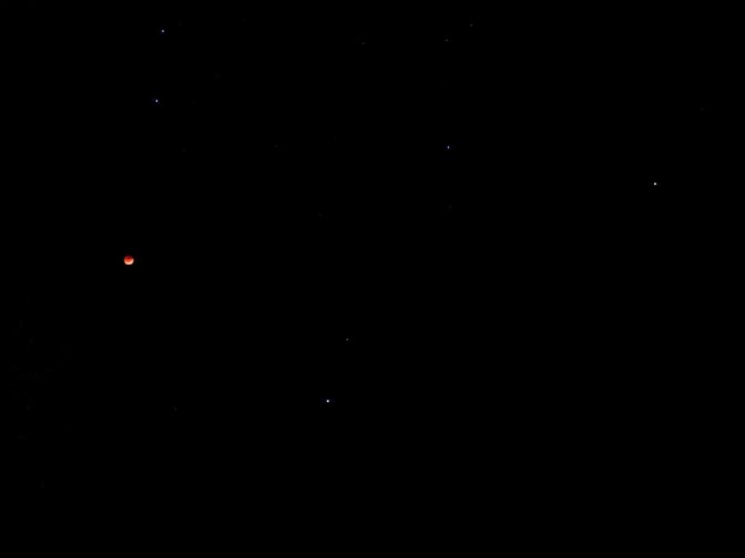 Lunar Eclipse 01-21-00 - photo 2 After I prepared the photograph at the top for this page I happened to look out the window and the skies had become completely clear and I noticed the characteristic curved shadow of the Earth cutting into the moon's disc and decided I had been looking at a monitor when I should have been outside continuing to witness the eclipse. I hurriedly reset-up the scope and gathered up the cameras again and zoomed out into the frigid air. Made this one above 1 am (the exposure time was quite short now ... much shorter than 1 second according to sound made by shutter) plus a few more photographs before the cold chased me back indoors! Oh, I even stopped the lens down to between f/11 and 8 for this second photo session. I wonder how I will wake up this morning ... it is already 1:30 pm Bigger version located here Both of these photographs were made through the "telescope" and so are upside down and reversed in relation to unaided view of the event. They are presented here as seen through the telescope (although I could have easily flipped them while preparing them. In fact, I forgot about this "quirk" associated with images made through telescopes! I have one photograph made without the aid of a scope and it shows the position of the Moon in relation to the stars. It is included below. Of course this is an "unreversed" view but to tell the truth I forget the orientation. It was made at the widest angle setting on the camera and includes some stars (planets?) that may provide guidance as to the actual orientation of the photograph.