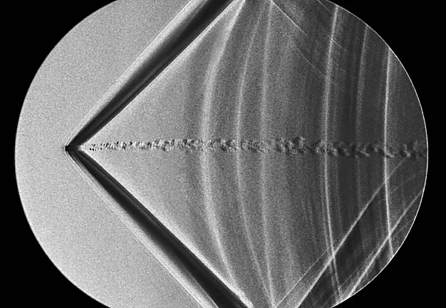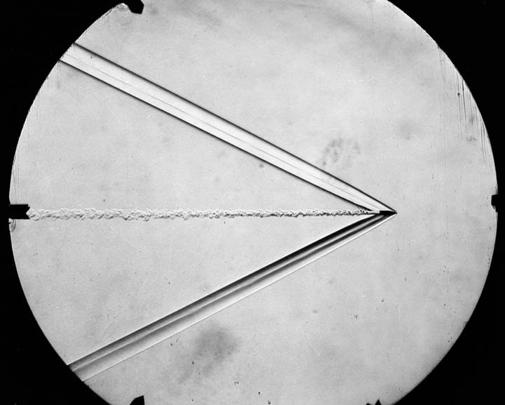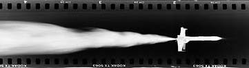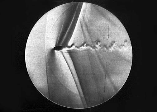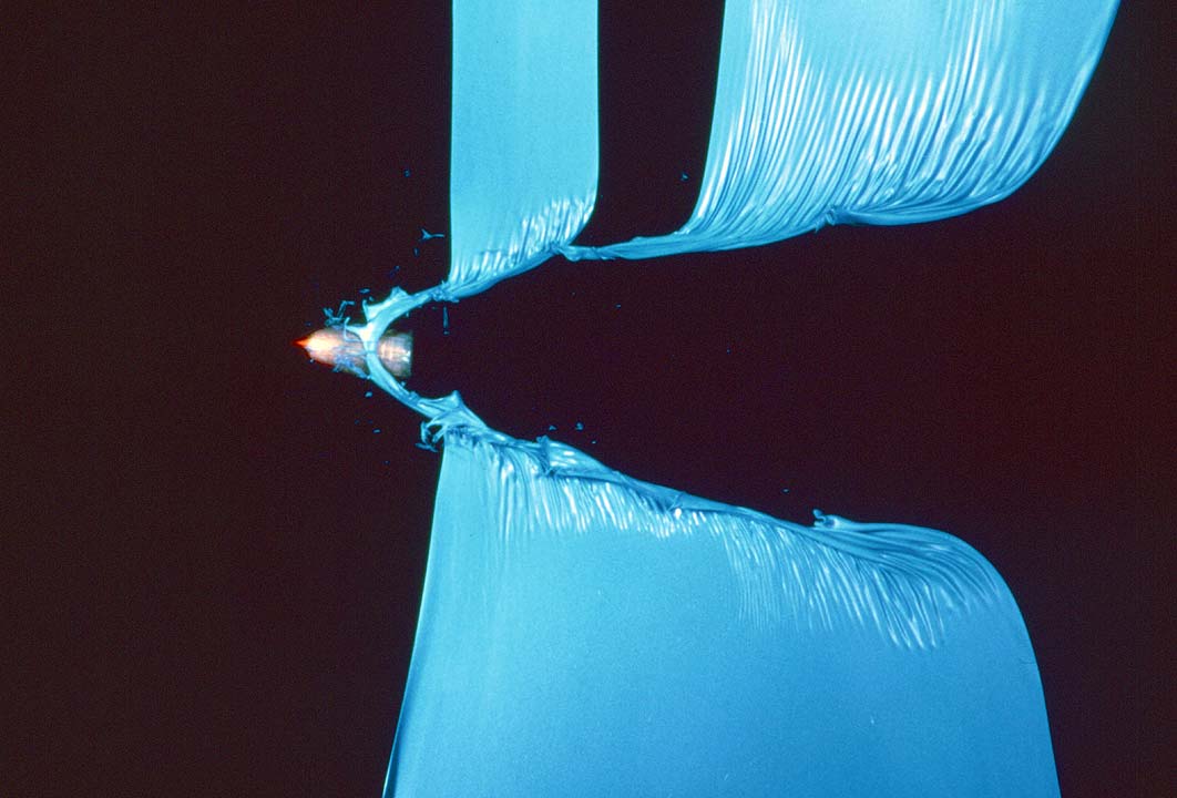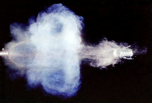 Series of individual 1/1,000,000 second exposures showing shotgun firing shot & sabot separation