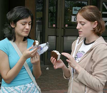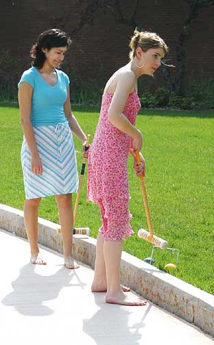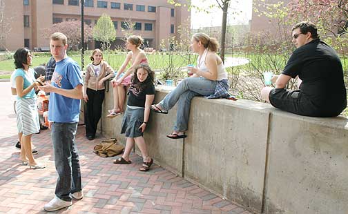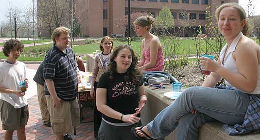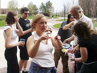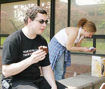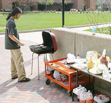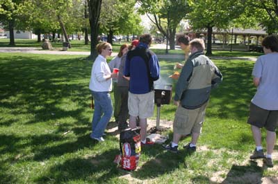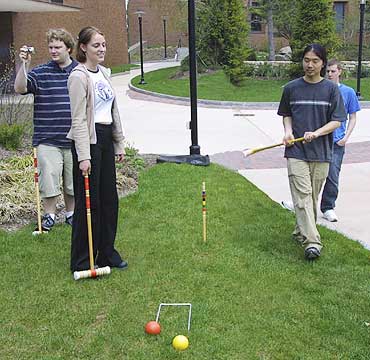 The umpteenth Spring Picnic and Barbecue jointly organized by the TPSA, SPIE and IPT was held on May 1, 2004 in the newly remodeled and refurbished Eastman Kodak Quad area in front of the School of Photographic Arts and Sciences. The event went off without a hitch in spite of thunderstorm warnings issued earlier in the day. Attendace to this annual ritual exceeded all expectations with students from all years in the program in attendance. Black Bean Burgers and Tofu Dogs as well as chicken beast patties complimented the usual fare of sirloin burgers and dogs. In particular, the newly introduced (to this event) Fat Boy ice cream sandwiches were the hit of the food fest. It seems like the Summer Fairies smiled on the attendees as the sun was out throughout the afternoon and provided the pefect setting to engage in such physically strenuous sport activities as croquet, bocci ball and frisbee. Photographs by Matt Swain, Carl Smith and Anonymous.