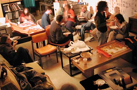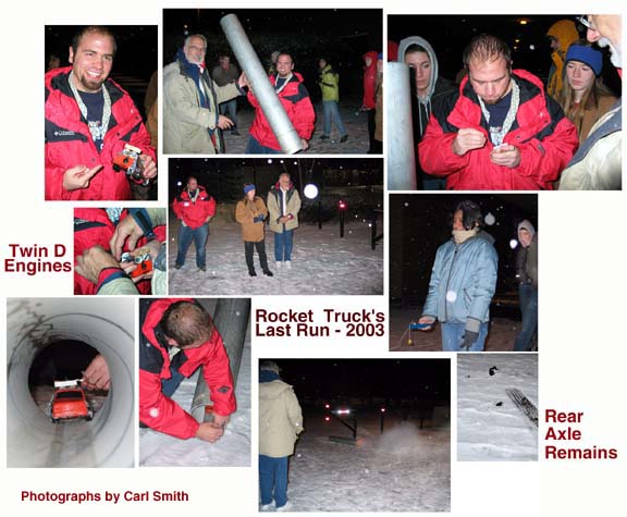 The events of the evening transpired with the viewing of a movie (Pirates of the Caribbean) played back on Bruce Butkus' DVD equipped laptop. This was follwed by a traditional raffle of things lying about the alley and several techs walked away with interesting prizes. For example, Jenna Venturini became the keeper of Rus Kraus' Pradovit 35mm slide projector while others became proud owners of lenticular flip images depicting Xena, the warrior princess, smashing her sword on a hapless victim, and Luke Sorensen walked away with a newly printed science picture book. Then came the moment everyone had been waiting for. The Rocket Truck Run. Parts were assembled and the launch tube was prepared on the ramp. Anxious moments passed as final prepartions were made. Two spectacular runs, triggered by Elizabeth and Trina were completed without incident. However, just as a decision was being made to do one last run Campus Safety drove up the ramp. Whew! False alarm. They were coming to lock a door for someone in the art school! Anyway, once nerves were again settled, Jeff Detrick decided to install a double whammy on the vehicle: 2 D engines. They were properly held in place by the Handyman's Secret Weapon, Duct tape. When it came time to launch the igniters would not ignite but after a few seconds of holding the firing pin to the metal suddenly, in a burst of flame and fire and an ear-splitting roar of the solid fuel boosters the truck careened down the launch tube and emerged trailing a comet-like trail of sparks and smoke. It made several pirouettes in space as it flew down the predetermined flight path until it finally landed next to a pine tree and, just before shutting down forever, it gave one last gasp it seemed, and belched thick black smoke accentualted by a loud report of the exploding engines. Then it was all quiet - except for the thunderous applause of an appreciative audience of techs who went to retrieve the remains of the truck scattered over the neighborhood. It was a fitting demise for the little red truck that could ... until December 11, 2003!