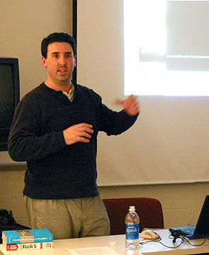 The Technical Photography Student Association in collaboration with the student chapter of SPIE and the Imaging and Photographic Technology department organized a lecture, "Flash for Rich Internet Applications" by Tech grad Phillip Kerman, '89, on Tuesday, April 6 at 7:30 pm. He said: " Flash can do much more than gratuitous animations-it's the perfect front-end to complex data because you can add rich media and compelling interactivity. Besides the existing support for XML and flat text databases, Flash now seamlessly exchanges data with application servers and web services. In addition, the Flash Communication Server lets multiple users connect to the same live data including streaming media. The benefits of rich-internet applications created in Flash include an immersive branded interface, local storage of complex data (beyond what cookies can do), and no need to refresh the browser - which all lead to a better user experience."