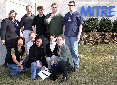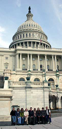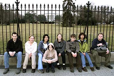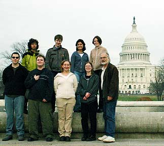 ... well, that is all I can remember from the NGS - oh, they don't have openings and everyone loves their job! BTW, as seen in the group photo with the MITRE corporate logo we also spoke with government agency representative Scott Bogart, Tech grad from 2 years ago of NGA (National Geospacial Imagery Agency) on left and visited several labs of a major defense contractor (MITRE Corporation) as guests of Rick Behrens, Tech grad from about 6 years ago, standing next to Scott. They both agreed that Tech grads have the "right stuff" and that the Modulation Transfer Function rules. Oh, we also did the usual touristy thing of perambulating on the Mall and we got to visit the House of Representatives while it was in session as the guests of the representative from Florida. At the hostel where we stayed we celebrated Elizabeth's birthday with pizza, cake and ice cream and met with other hostelers from England, Puerto Rico and China and we had an animated converstaion on world politics. All in all we had a pretty good time.