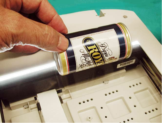 A quite straightforward method of making a rollout photograph of something like a cylindrical can or even a piston is to place it on the glass platen of the flat bed scanner and acquire a scan as if you were about to scan a document page. Of course you have to keep the platen uncovered! You probably should cover the calibration slot of the scanner with white paper so the software assumes it has a white document to scan. Non uniform lighting of light distribution along that calibration slot will produce bands of light and dark along you resulting image. Then, as the scanner starts to move and begin the scanning process roll the cylinder along with the rate at moving light wand moves. The more evenly you track the movement of the light wand the better the peripheral reproduction of the subject will be. You are obviously limited by the length of the scan platen as far as the circumference of the object you can wholly scan in one pass but if you can deal with multiple scans you should be able to accommodate a fairly large number of object diameters. As shown in the illustration below approximately 1 1/2 revolutions of the can are reproduced in the final image. The original record was slightly longer but it was cropped to these final dimensions. Careful examination of the resulting record shows that the can was not always turning at the appropriate rate since the label components flanking the main label are not the same length. However, considering that the rolling was hand-controlled the results should be quite acceptable for most purposes. ![]() ![]() ![]() An alternative to using a flat bed scanner is to make a peripheral or rollout record using a standard camera. The premise is, again, that while rotating as it passes across the field of view of the camera will show all sides of itself to the camera' lens and thus the final record will be a 360 degree representation of the object. While this is the case, the record can not be made simply by rotating and translating the object in front of the camera lens. The reason for this is that as he object moves from one side of the frame to the other it must “show” its surface details to the camera lens as if these were standing still. Otherwise a blurry record is made. Analyzing the situation it becomes obvious that if the object is rotated during its translation in such a manner that its direction of rotation matches the direction of motion of the object than there will be significant movement of the surface details resulting in complete blur. What needs to be done is to devise a counter-rotating process whereby the camera, looking at the object's surface, will record the surface sequentially but simply as if it were standing still. This induced counter rotation makes the view through the slot in the translation stage, illustrated below, one that meets the requirements mentioned earlier. When in motion,it is as if the slot moves across a stationary, flat, surface. To make a peripheral record the slot in the carriage box is adjusted so that it is just above the surface of the subject being photographed. In this case a can of soda. The camera, attached to some appropriate support is aimed directly downwards and focused on the surface of the object. Generally the camera can be simply focused on the edges of slot. Then the carriage is moved to one side or the other so that the slot is out of the field of view of the lens. The lens at this point "sees" nothing but the black velvet of one of the masks. The shutter is opened for a couple of seconds and during that time the carriage is rolled on its rollers so that the slot is located on the other side of the camera's field of view. In the process of this movement the rollers below the can force the can to counter-rotate to the travel direction of the carriage making the surface of the can appear to be standing still as the carriage moves from one side of the camera’s field of view to the other. Obviously the black velvet is exposed all over the sensor or film surface for the length of time it take the camera shutter to remain open so that is why it is important to make sure the top of the masks is as dark and non-reflective as can be achieved. The traversing or carriage box can be made of just about any kind of material. On its sides it should have a series of channels that will permit locating the slot defining masks at various heights to accommodate subjects of different diameters. The wheels on which the subject rotates and which allow the whole box to roll from side to side may benefit from having a system whereby their separation can also be adjusted as this may come in handy for objects of different diameters as well. ![]() ![]() ![]() The slot size and the rate at