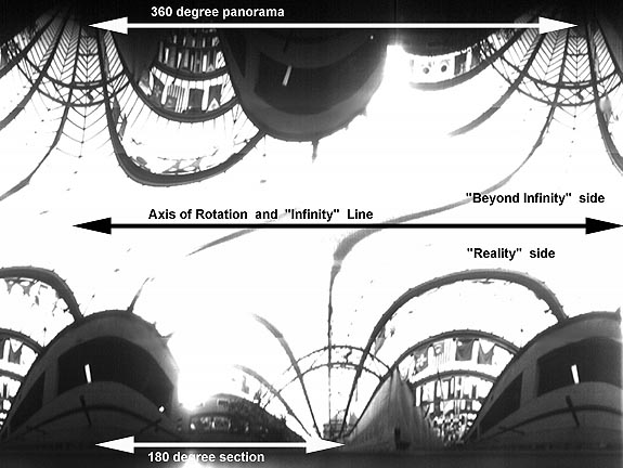 In the next case the camera's lens was fitted with one of those "through the door" surveillance peep gadgets. This enabled the camera to have a very wide angle of view along the CCD array. The camera was then pointed almost straight up and rotated. In this photograph (despite its minor flaws related to leveling and consistent scanning rate, etc.) the relationship between what is in front of the camera ("reality") and what is "beyond infinity" is much more clearly evident. I hope anyway!