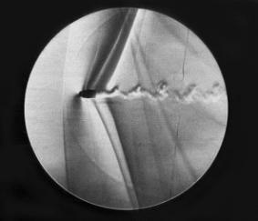 Figure 18. Bullet in flight by schlieren technique< The light continues into a camera where the image of the second mirror's surface appears to be filled with light. Introducing a "knife edge" into the image of the source causes an overall drop in the light level of the mirror's surface. When the image of the source is moved by refractive index gradients in the space between the source and its image, local variations in light level appear in the image of the second mirror's surface. Photography is almost secondary to the process although just about every industrial Schlieren system is designed with a camera of some sort incorporated in the system. Double pass Schlieren systems. When the sensitivity of the above design is not sufficient, light can be made to pass through the density gradients twice and thus the sensitivity is increased. This is commonly accomplished by using a single mirror and placing the camera and the source close to each other and both located approximately two focal lengths from the mirror's surface. In this fashion a life-sized image of the source is formed just in front of the camera lens.