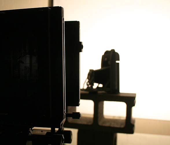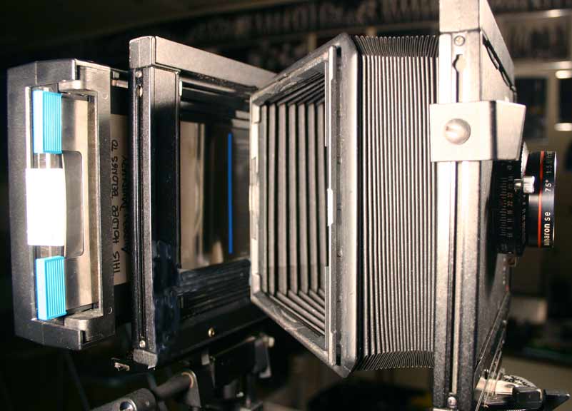 As seen in Figure 3. The capability of the Sinar camera of detaching the bellows from the rear standard or film holder assembly of the cameras is what makes the process so easy and affordable. After the subject is set-up in its location as shown in later steps of the process as shown in the illustration the bellows is detached from the back and the desired transparency of the location chosen by the photographer is inserted and lightly attached with tape, (upside down and reversed left to right) just in front of the film holder's dark slide. This is shown in figure 4.
