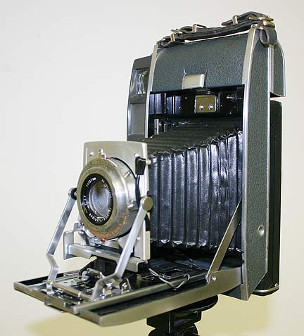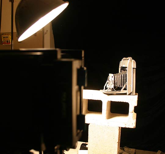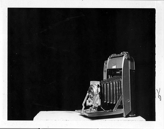 Now, without disturbing the camera, the background of the scene behind the camera is replaced with a black, light absorbing, material. Black velvet is best. As shown in Figure 9 the light illuminating the background is turned off and the camera itself is now lit according to the taste of the photographer but trying to avoid light falling on the black background. This is to ensure that even though black it does not cause any additional exposure to the film that would wash-out the previously recorded "contact print" of the transparency. Figure 10 is an illustration of what an exposure of just the camera against the black background would look like. The exposure for the camera is now determined by adjusting the exposure time and not changing the lens aperture from that which was used for the first exposure. The reason for this is that as the aperture is changed edge detail changes since depth of filed changes and for a good match between the successive images the edge characteristics of objects within the scene should remain constant. The shutter is recocked and fired. What this exposure does is to essentially fill in the unexposed areas that remained after the first exposure but without affecting areas that were previously exposed during that first exposure. ![]()
