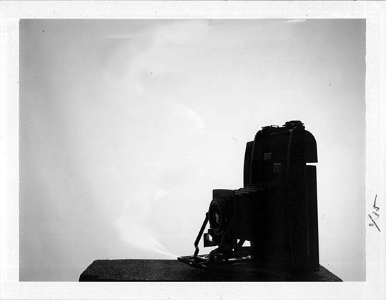 Next the subject is placed in front of the camera and it will be evident that it is now set up to be lit in silhouette as shown in Figure 6. The view through the camera (without the transparency in place) is seen in Figure 7. The dark slide is removed from in front of the film holder and the same scene is photographed this time with the transparency in place. This yields a result as shown in Figure 8. Wherever the background was white, the light casts a shadow image of those regions of the transparency onto the film behind it. But where the Polaroid camera is located the film records no exposure because the camera stops any light from getting to those areas of the film where it's image is located. The dark slide is reinserted after exposure to cover up the film. At this time the bellows is disengaged from the back standard and the transparency is removed. The dark slide then is again removed.