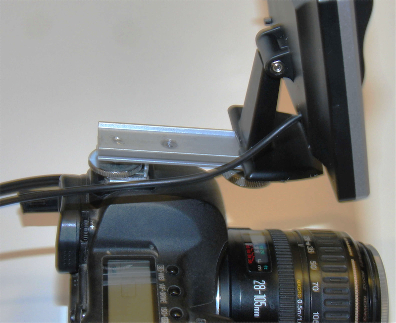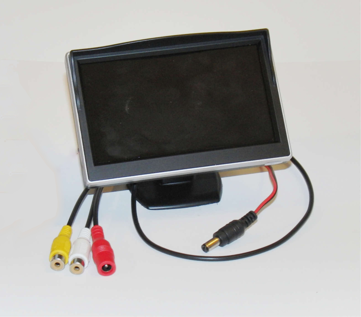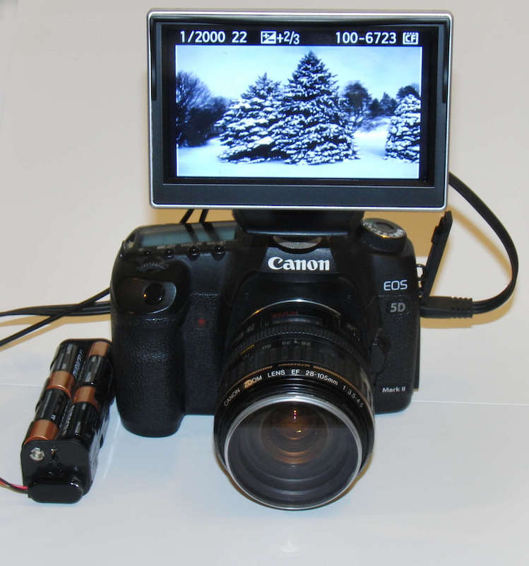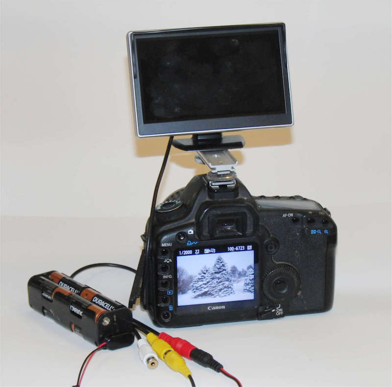 Email: andpph@rit.edu Web: andpph.com I was often disappointed by my Canon 5D Mark II not having a flipping or better yet a detachable monitor. Instances of this happened when I placed the camera on a fully extended tripod and had the camera pointed downwards to make a photograph of something on the floor. Getting one’s eye above the view screen was sometimes impossible. At other times I wanted to shoot from a very low angle or position and getting my face down to the camera was equally difficult. Cameras with view screens that flip out or up and possibly rotate overcome these problems. What to do? I knew that my camera had a video out capability and I had used it often while teaching as it allowed me to display on a large screen what was going on with the camera. But my “strange camera position” requirements needed an independently powered and portable display. We have a rear view camera on our camper that transmits a rear view to a small display or monitor in the cab. This got me thinking. Could I use such a terminal to hook-up my camera to? Well, to test the practicality of this possibility I bought a $20 5” diagonal TFT color monitor advertised for use with a car backup camera. It required 12 volts provided by the car battery. It had a video-in connector. And a power connector.